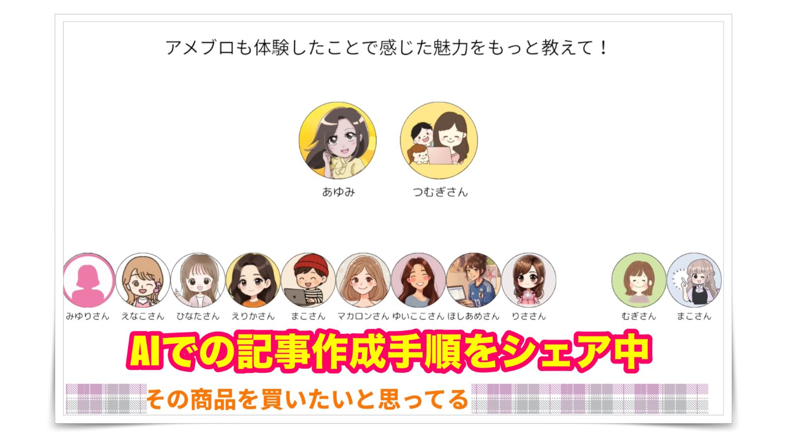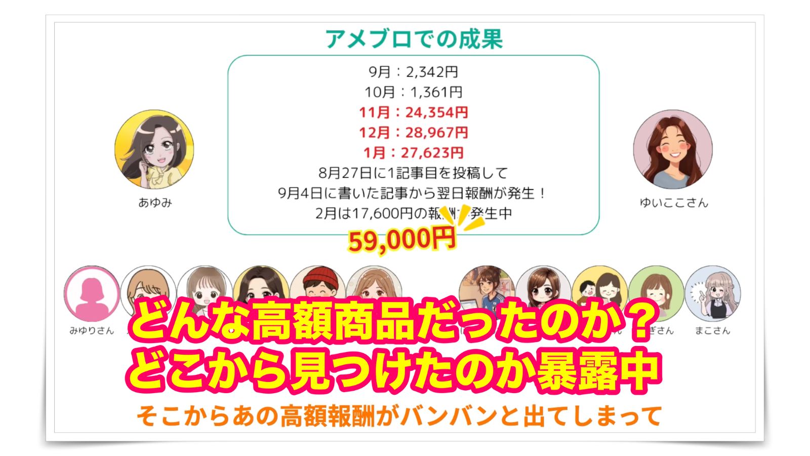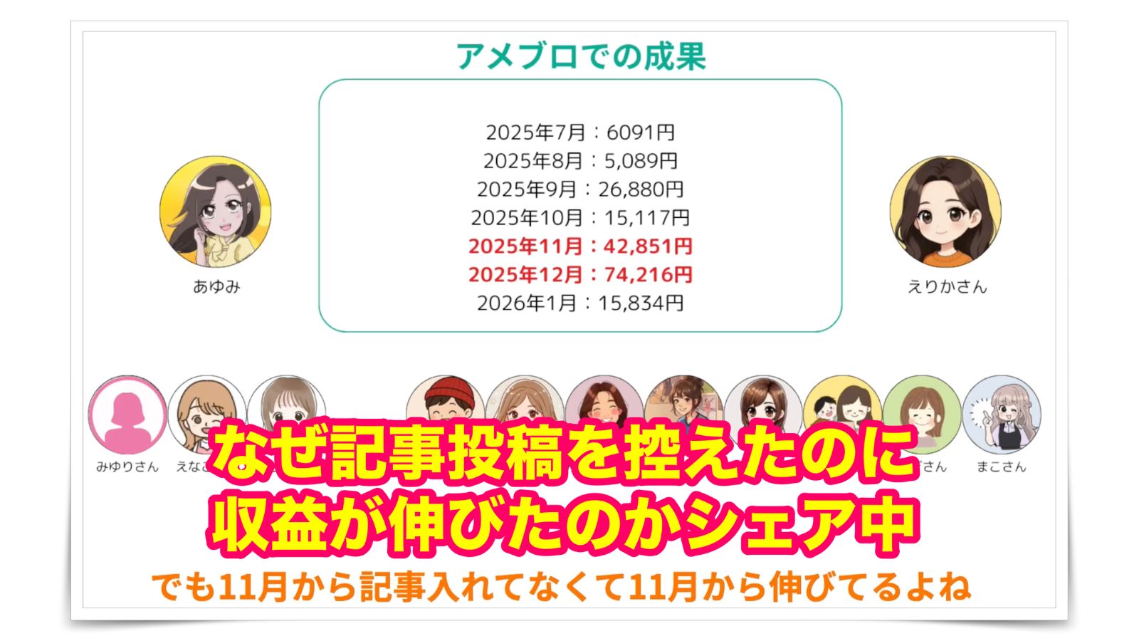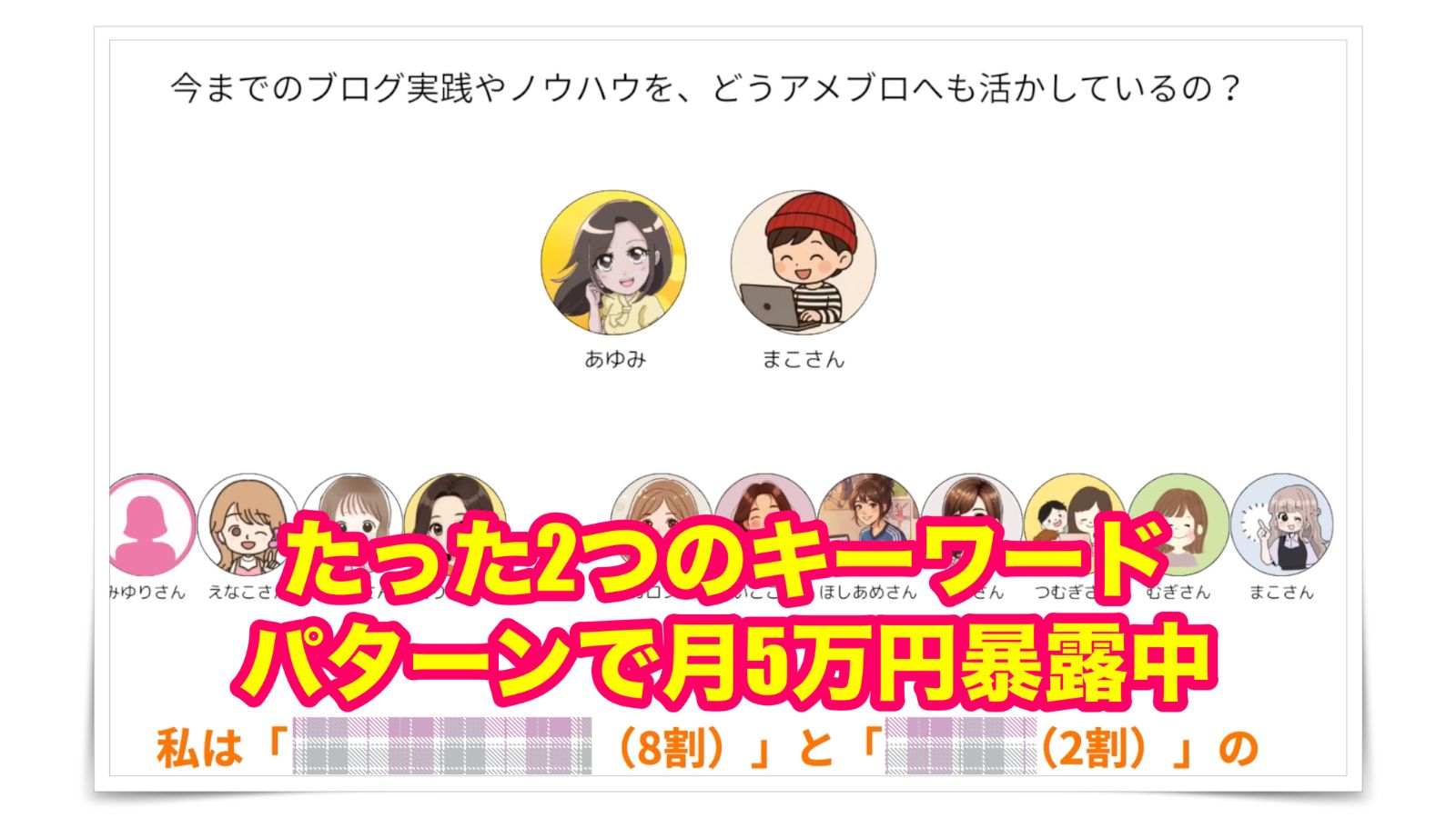 今回は、教材内でシェアさせてもらったことを取り入れ、ブログ収益を伸ばし、独自の得意戦略と、いま稼ぎやすいと注目されている『アメブロ』にも教材で得たものを活かしながら収益化できている実践者さんたちから、具体的なアメブロ実践の様子などを「聞きまくりました!」